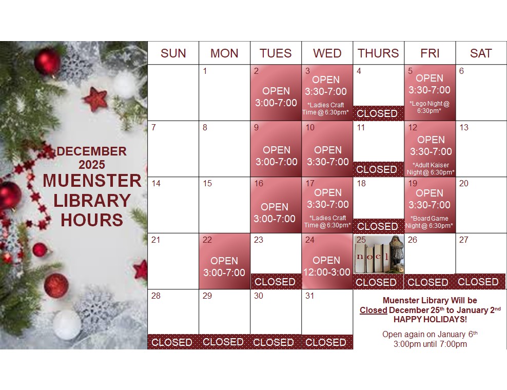 News & Notices All News & Notices Latest Public Notices Oct 22, 2025 List of Lands In Arrears 2025 Aug 22, 2025 Public Notice - Bylaw to amend Zoning Bylaw and OCP Jul 29, 2025 Special Meeting of Council Latest Newsletters Newsletter - March 2025 Newsletter - December 2024 Newsletter - September 2024 Muenster Library Dec. 2025 Schedule News Posted on December 1, 2025
