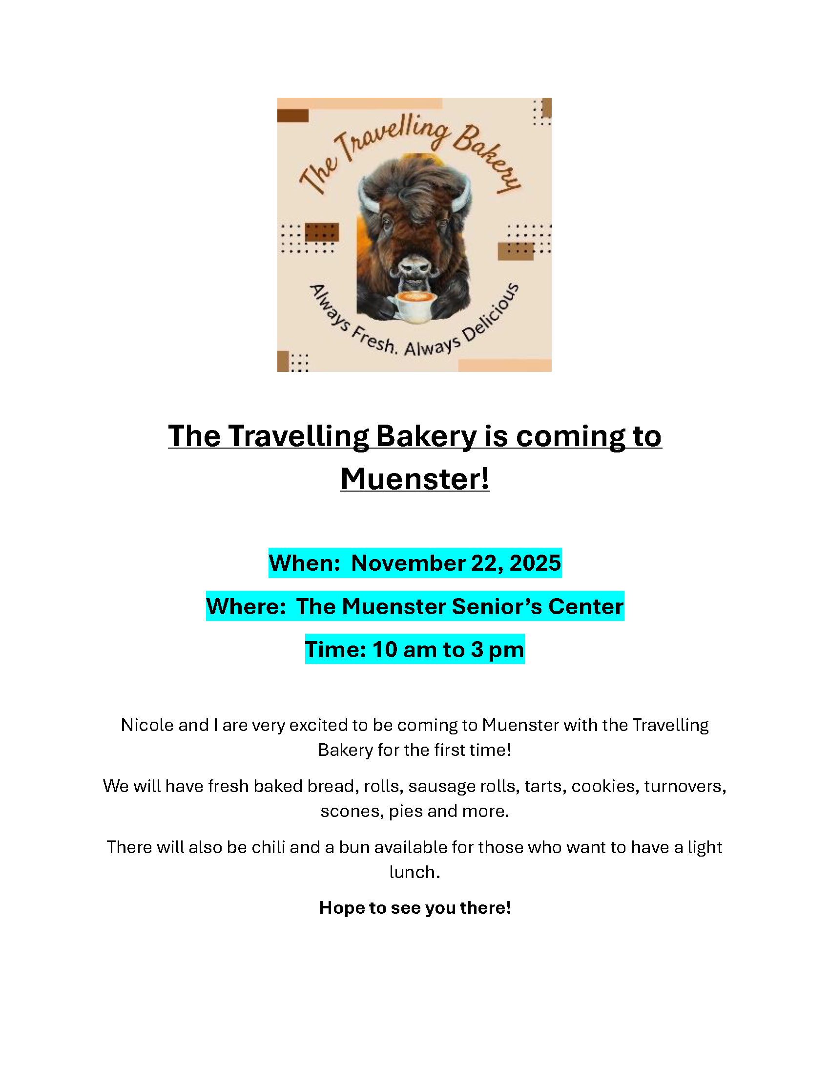 News & Notices All News & Notices Latest Public Notices Oct 22, 2025 List of Lands In Arrears 2025 Aug 22, 2025 Public Notice - Bylaw to amend Zoning Bylaw and OCP Jul 29, 2025 Special Meeting of Council Latest Newsletters Newsletter - March 2025 Newsletter - December 2024 Newsletter - September 2024 The Travelling Bakery is Coming to Muenster! News Posted on November 17, 2025